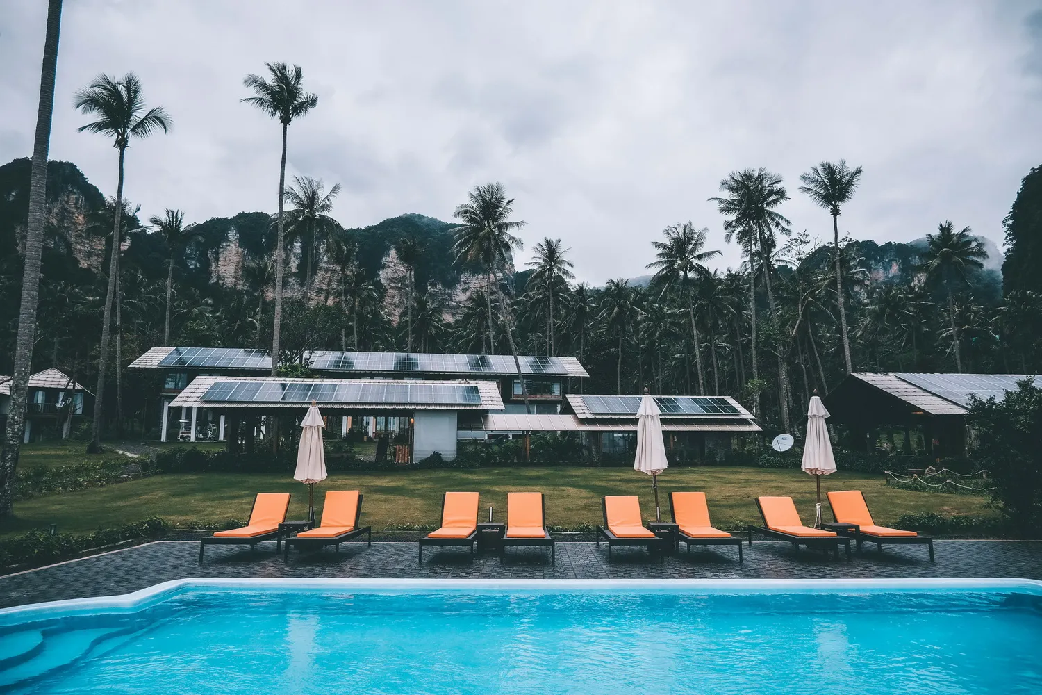 สระว่ายน้ำตั้งอยู่ด้านหน้าที่พัก ท่ามกลางทิวทัศน์ที่สวยงามของต้นมะพร้าวริมชายหาด
