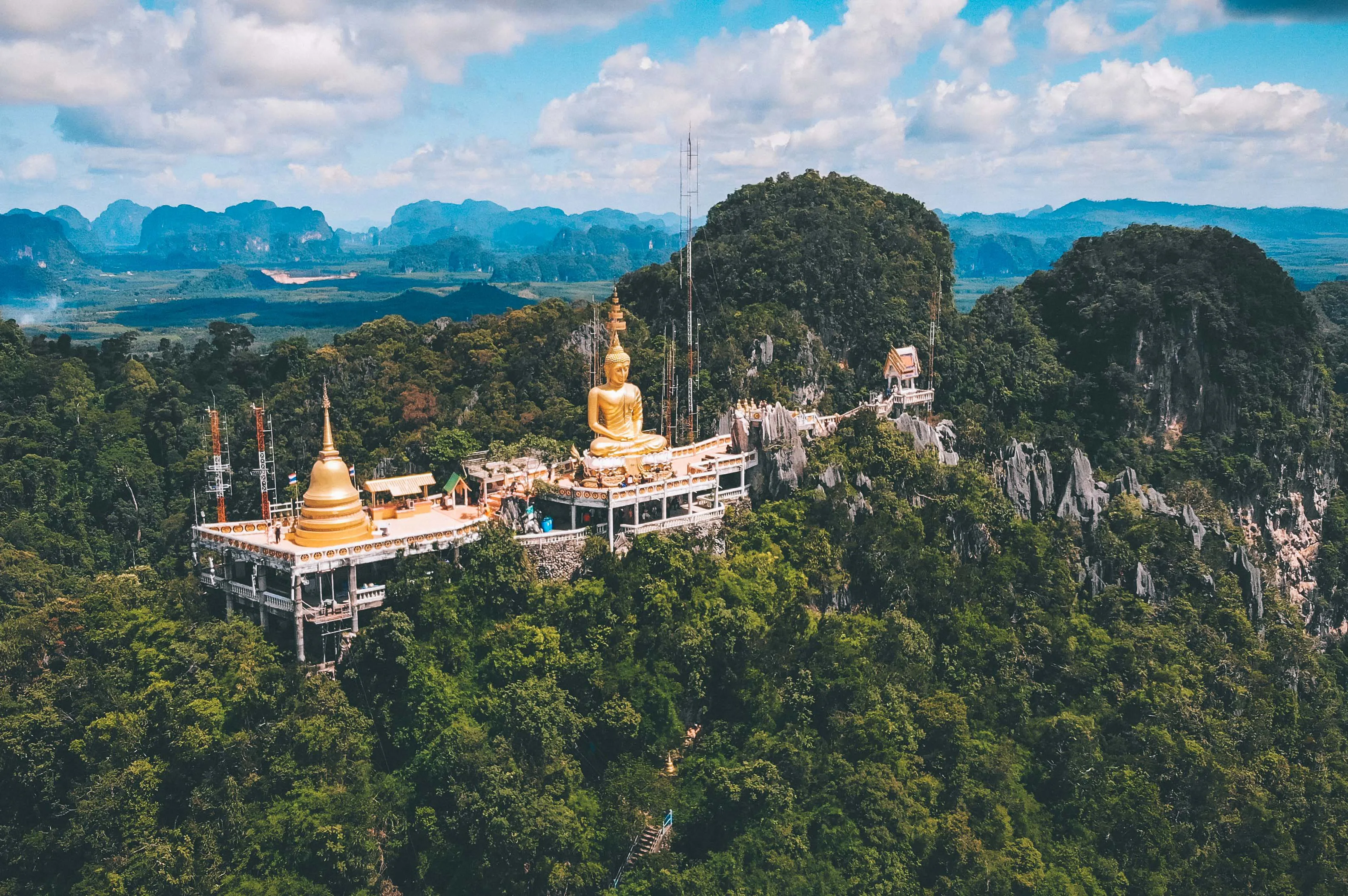 อีกหนึ่งความอเมซิ่งของจังหวัดกระบี่ ที่อยู่ไม่ห่างจากตัวเมืองมากนัก เพียงขับรถออกมาแค่ 9 กิโลเมตร เราก็จะได้ตื่นตาตื่นใจกับพระธาตุเจดีย์ยอดเขาแก้ว พระพุทธรูปองค์ใหญ่ที่ตั้งอยู่บนยอดเขาแก้ว มีความสูงเหนือระดับน้ำทะเล ประมาณ 600 เมตร เราสามารถเดินขึ้นนบันได 1,237 ขั้น เพื่อขึ้นไปสักการะพระธาตุเจดีย์ยอดเขาแก้ว นอกจากนั้นยังได้ชมวิวปัง ๆ ทิวทัศน์ของเมืองกระบี่ได้แบบ 360 องศา จุดนี้ถือว่าเป็นทั้งจุดชมวิวพระอาทิตย์ขึ้น และตกได้อย่างดีเลยหล่ะ