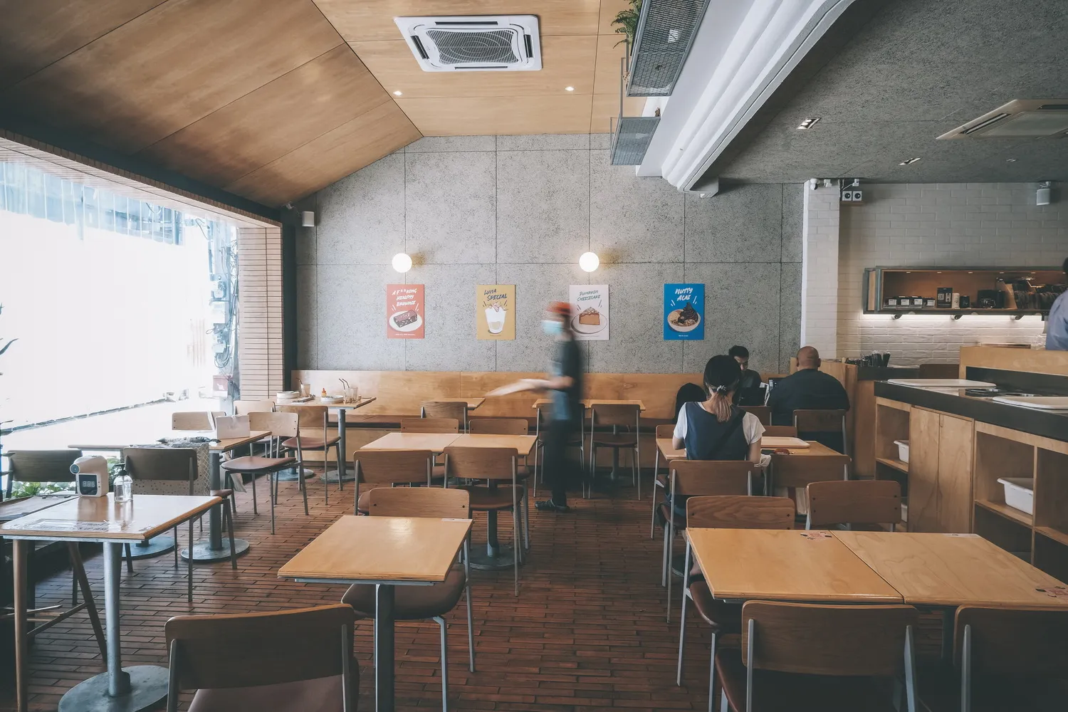 การตกแต่งในร้านก็จะเน้นพื้นอิฐสีส้ม กับเฟอร์นิเจอร์ไม้สีน้ำตาลอบอุ่น พนังขาวผสมกับปูนสีเทาดูโมเดิร์น ๆ แม้จะแตกต่างแต่ก็ดูลงตัว กลมกลืนกันได้อย่างพอดิบพอดี