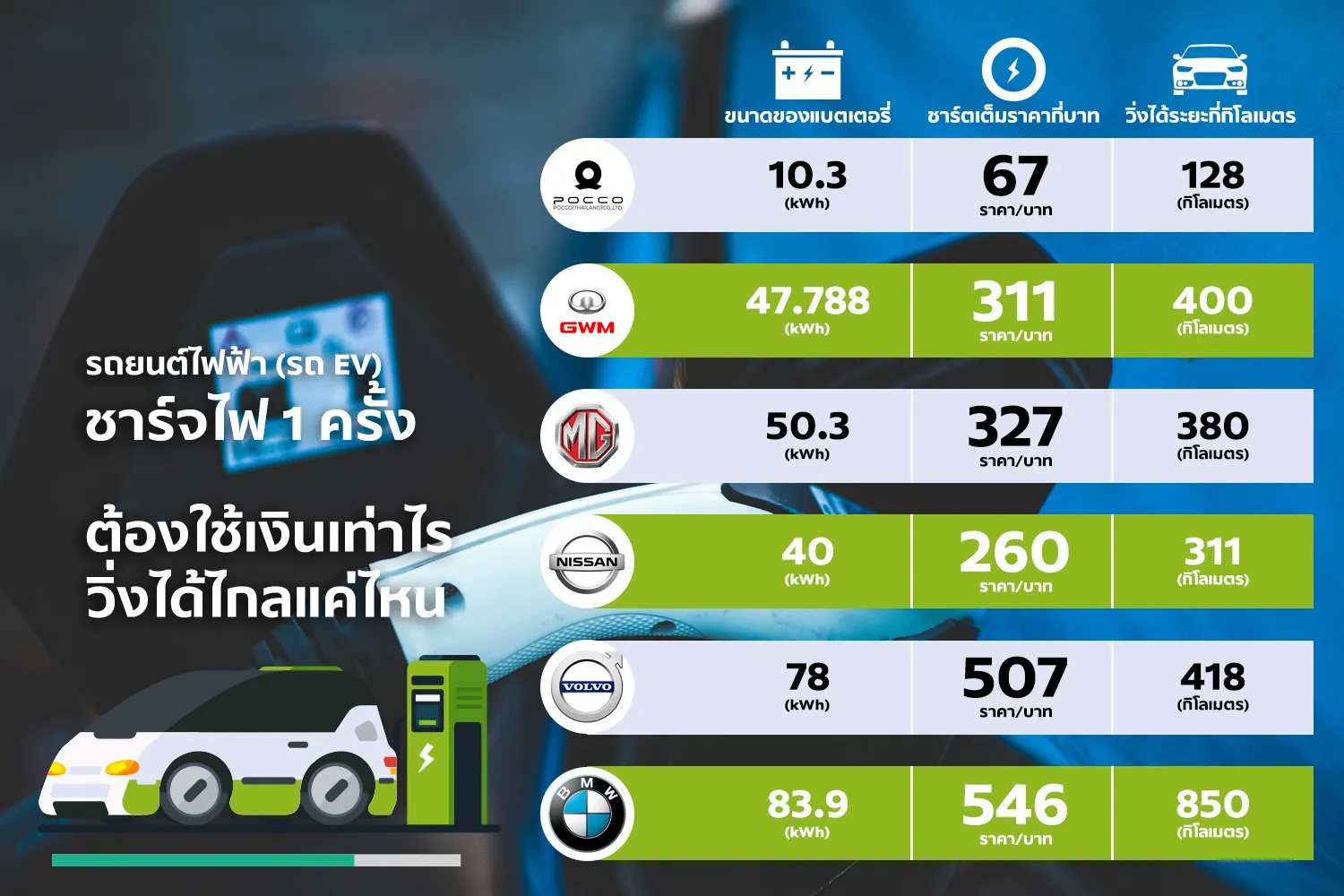 *อ้างอิงจากราคาค่าชาร์จจากค่าธรรมเนียมการชาร์จแบบเร็ว (Fast Charge) ของสถานีชาร์จรถยนต์ไฟฟ้า EA Anywhere