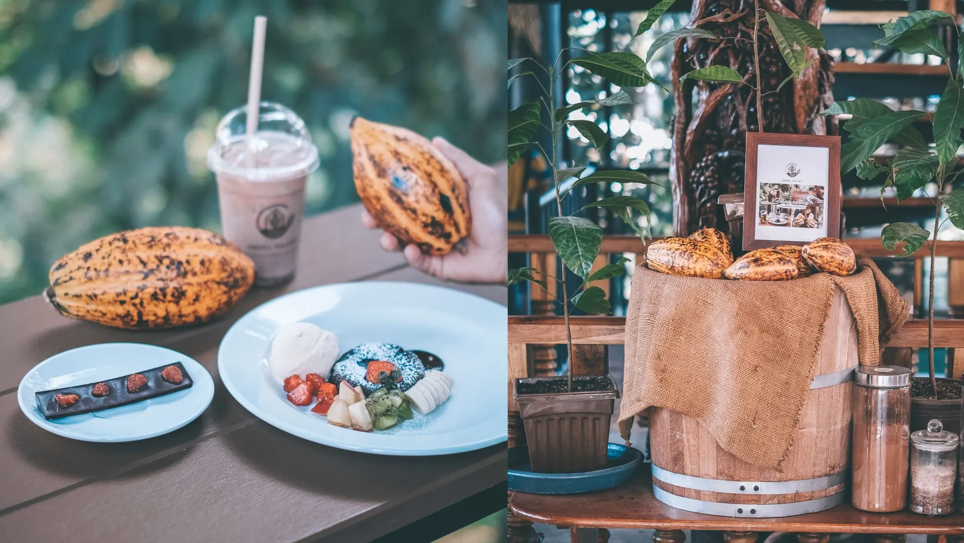 Cocoa Valley Resort เป็นทั้งที่พัก คาเฟ่ และสวนโกโก้ เรียกว่าคนที่หลงรักโกโก้ต้องไม่พลาดที่จะมาที่นี่เลย ฟินไปกับรสชาติของโกโก้แบบเข้มข้น หอมละมุน เข้าถึงรสชาติของความเป็นโกโก้แท้ 100% เมนูขนม และเครื่องดื่มที่นี่ จะทำจากโกโก้ที่ปลูกไว้ที่สวน ซึ่งเป็นสวนที่ปลูกแบบอินทรีย์ และบอกเลยว่าแต่ละเมนูเข้มข้นจริง ๆ