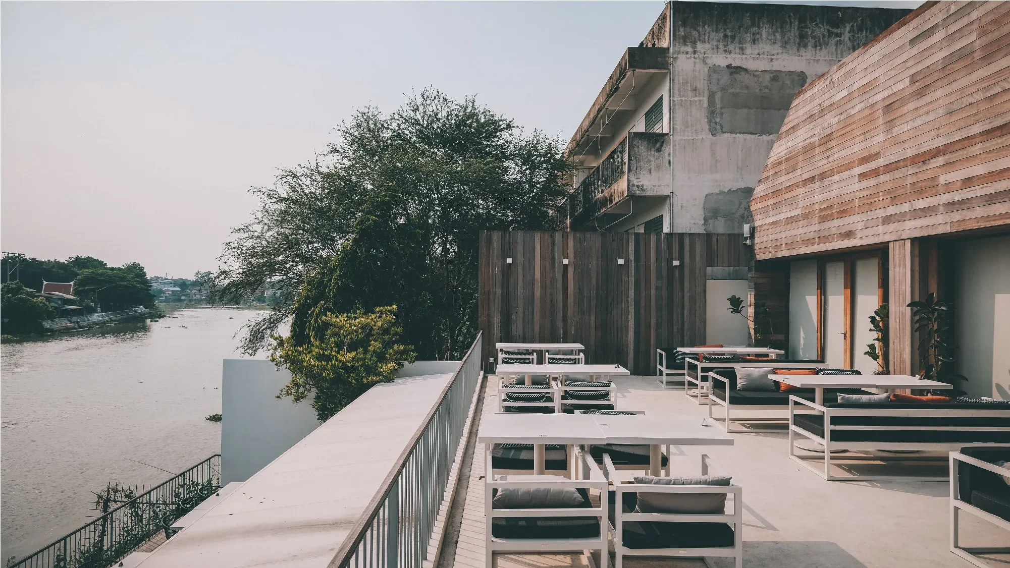 อีกหนึ่งร้านที่ฮิตมาก ๆ ในอยุธยา ที่เป็นทั้งคาเฟ่ ร้านอาหาร และโรงแรม ติดริมแม่น้ำเจ้าพระยา แน่นอนว่ามุมถ่ายรูปปังมาก โดดเด่นด้วยสถาปัตยกรรมการออกแบบที่โคตรจะเก๋ ของอิฐ และไม้ ไม่ว่าจะมุมไหน ๆ ก็เท่ไปหมด ก้อนอิฐหลากขนาดได้ถูกร้อยเรียงอย่างวิจิตรบรรจงจนกลายเป็นเอกลักษณ์เฉพาะตัวของที่นี่ และมุมไฮไลท์เด็ดที่ห้ามพลาดเลย ก็ตรงบันไดนี่แหละ คิวยาวหน่อย แต่ได้รูปปังแน่นอน