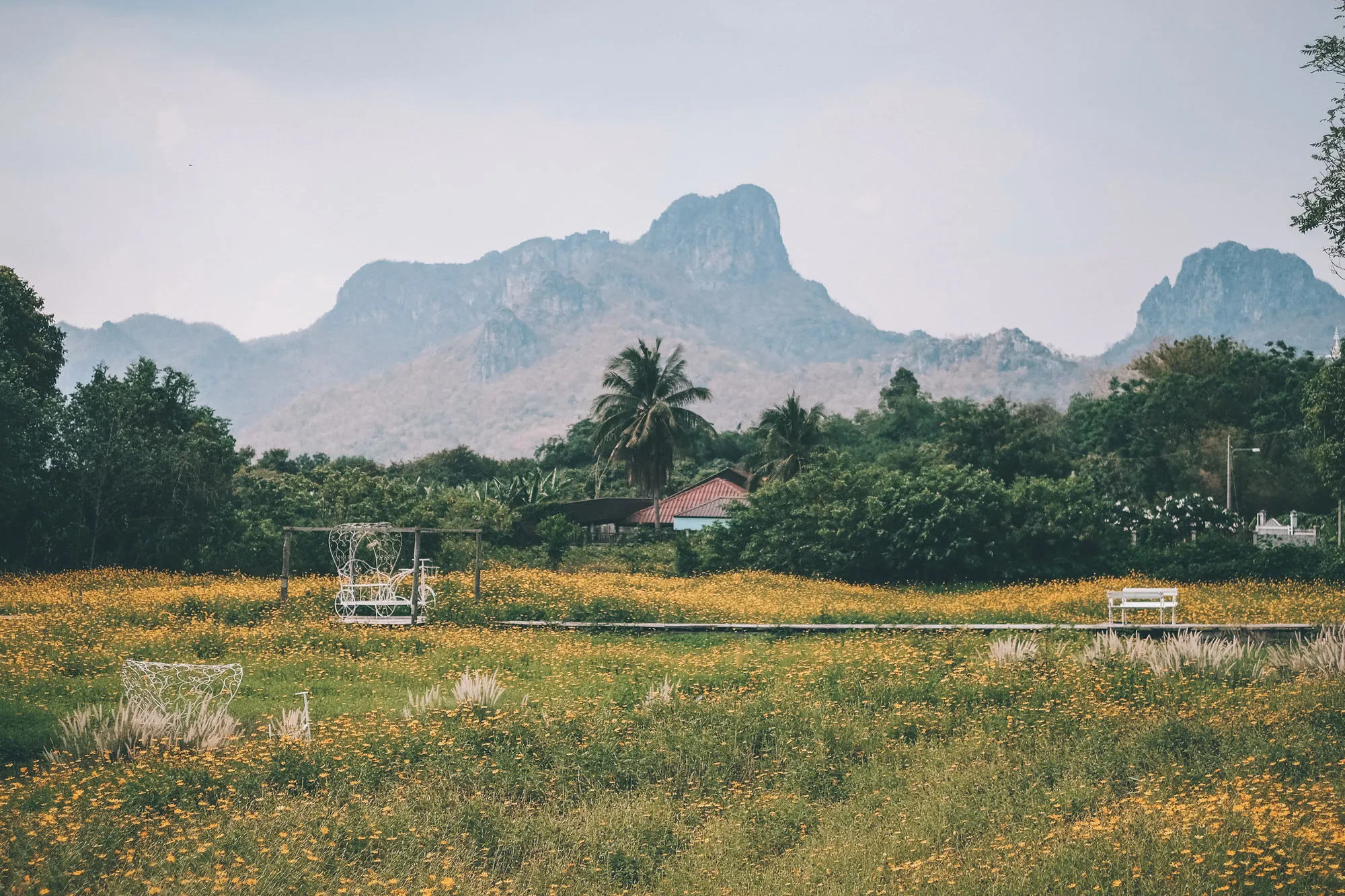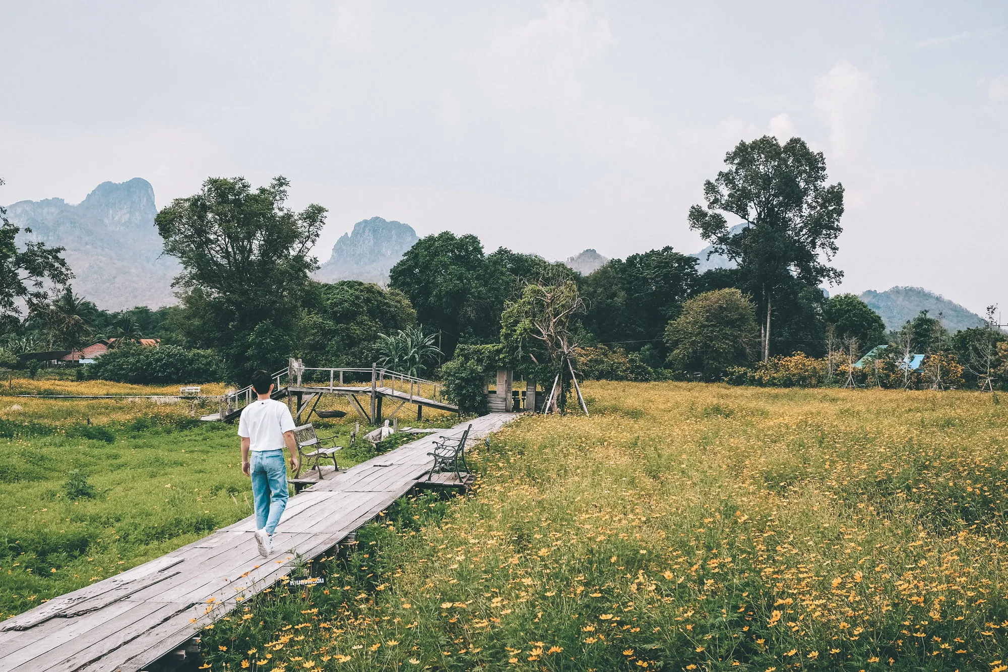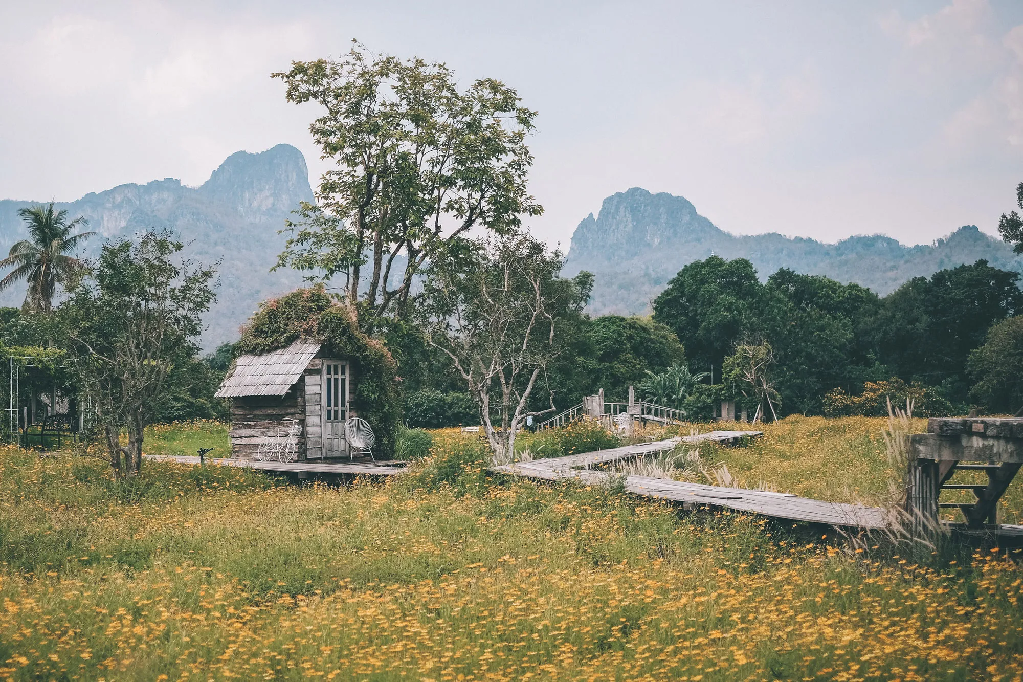 คาเฟ่ทุ่งดอกดาวกระจายสีเหลืองอร่าม สุดปังแห่งลพบุรี ที่มีสะพานไม้ทอดยาวท่ามกลางทุ่งดอก กับวิวเขาจีน และภูเขาหินปูนเป็นฉากหลัง ที่ใคร ๆ ก็ต้องแวะมาเช็คอิน ค่าเข้าชมสวนดอกไม้คนละ 20 บาท สำหรับตัวร้านที่นั่งไม่เยอะเท่าไหร่ มีให้บริการอาหาร และเครื่องดื่ม