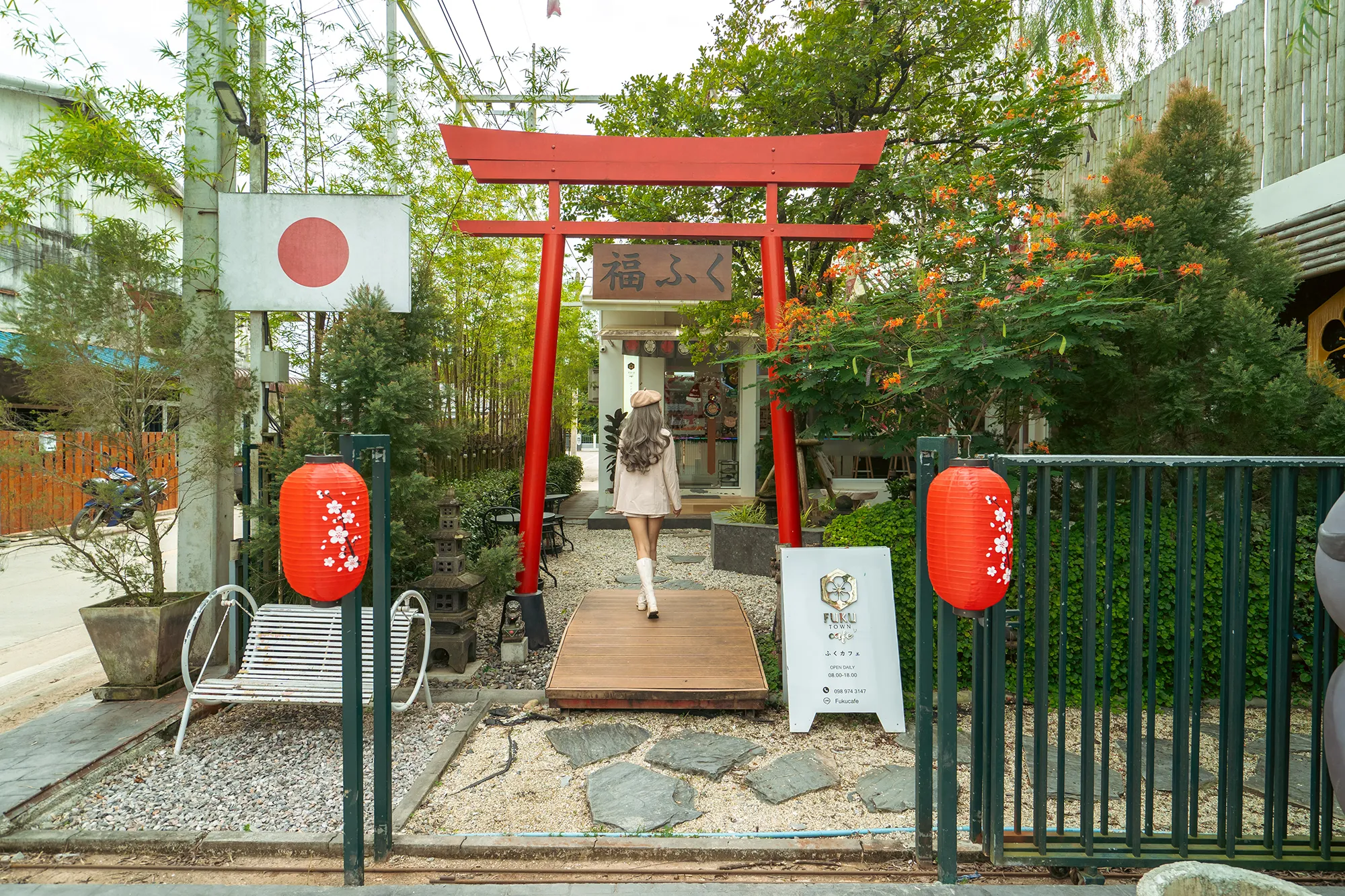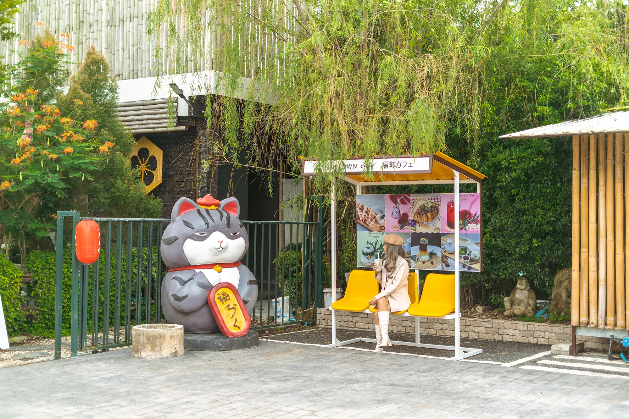 เป็นร้านเล็กๆน่ารักบรรยากาศสบายๆ มองเข้ามาจะเห็นเสาแดงมาแต่ไกล เสาแดงหรือเสาโทริอินั้นเป็นซุ้มประตูที่ไม่ว่าจะไปอยู่ตรงไหนทำให้บ่งบอกความเป็นญี่ปุ่นให้กับสถานที่นั้นๆ พอเดินเข้ามาในบริเวณร้าน ก็จะมีป้ายรถเมล์จำลองเก๋ๆเอาไว้ให้นั่งถ่ายรูปถัดมาก้อจะเป็นแมวนำโชคตัวใหญ่ยักษ์ ภายในร้านจัดไว้แบบโล่งโปร่งสบายมีมุมภูเขาไฟฟูจิเอาไว้ถ่ายรูปเก๋ๆ เรียกว่ามุมญี่ปุ่นสุดๆไปเลยนะมุมนี้ ทางร้านมีเมนูขนม เครื่องดื่ม และอาหารจานเดียว จัดไว้บริการอยู่มากมายหลากหลายเมนูเลย