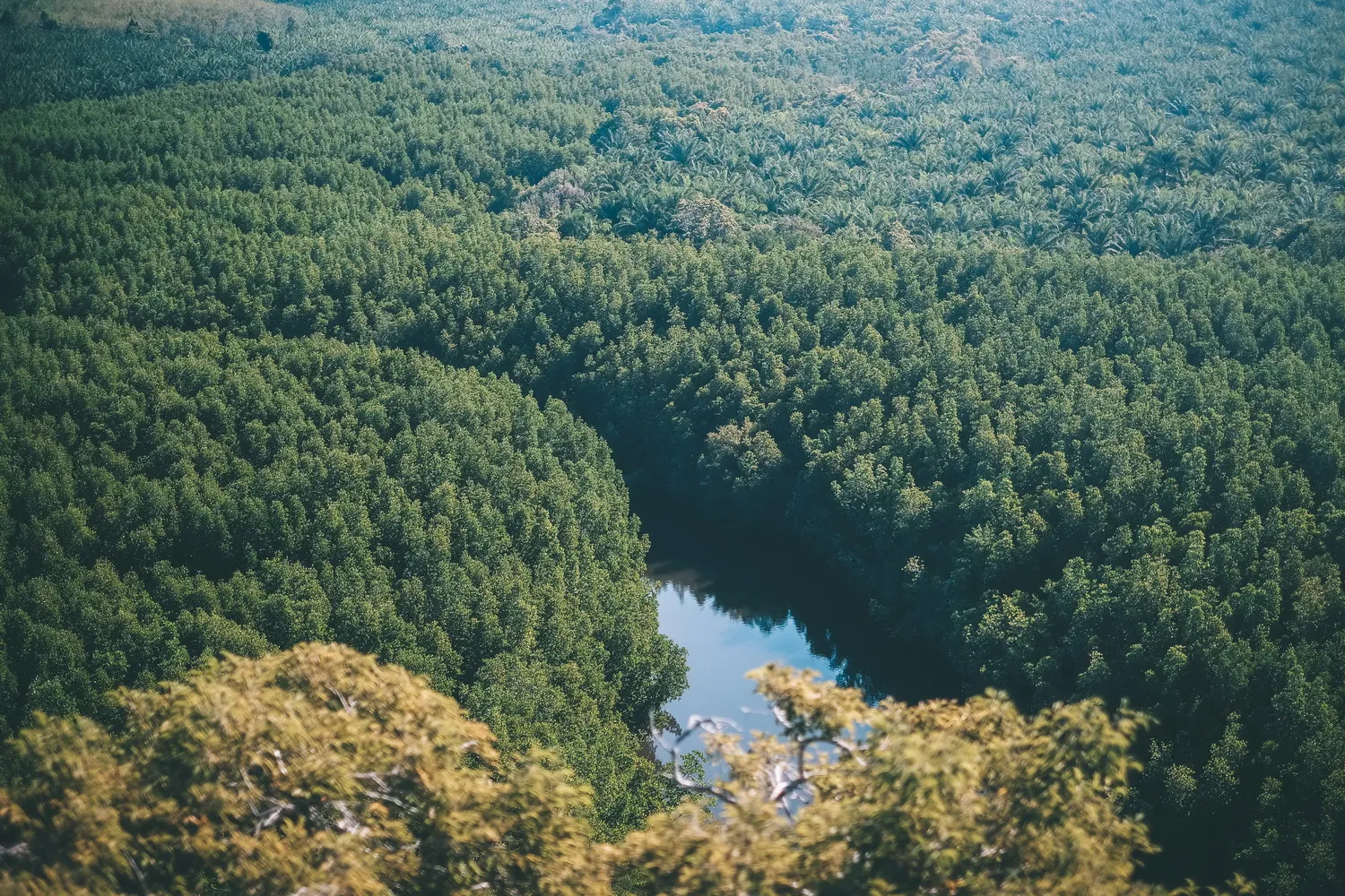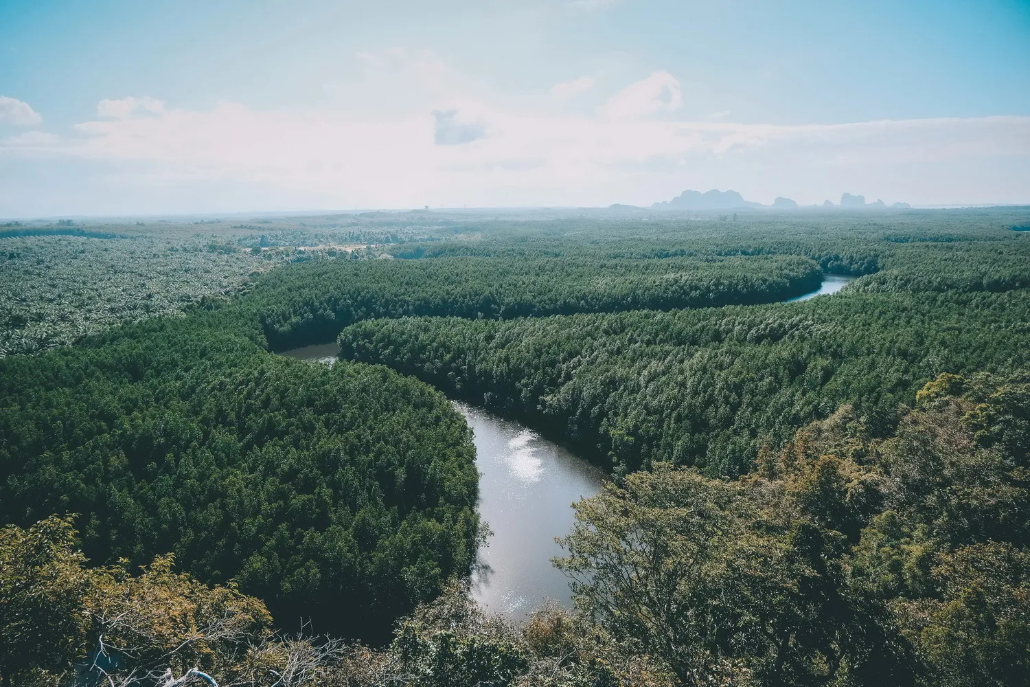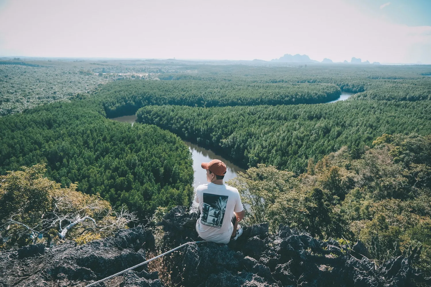 จุดสุดท้าย เดินขึ้นจุดชมวิวเขาจมป่า ความสูงอยู่ที่ 84 เมตร จากระดับน้ำทะเล ใช้เวลาเดินขึ้นไปถึงจุดชมวิวด้านบ้านประมาณ 15-20 นาที ระยะทาง 400 เมตร ถือว่าไม่ไกลเท่าไหร่ แต่ก็เหนื่อยใช้ได้เลยนะ ด้านบนเราสามรถชมวิวป่าชายเลยที่เขียวชอุ่ม มีคลองน้ำที่คดเคี้ยวไปมาไหลผ่าน ช่างเป็นภาพที่สวยประทับใจมาก ๆ ยืนชมวิวของป่าโกงกาง และธรรมชาติในระแวกนี้ได้แบบ 360 องศาเลยทีเดียว แถมยังมองเห็นวิวทะเล และเกาะมุกที่อยู่ไกล ๆ จากตรงนี้ได้อีกด้วย