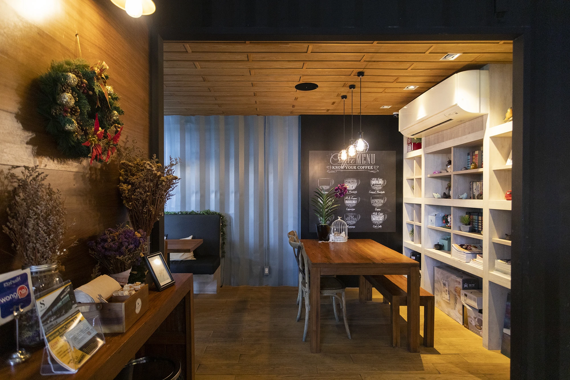 บรรยากาศของร้านให้ความรู้สึกเหมือนห้องสมุดขนาดเล็ก แสงอบอุ่น ชั้นหนังสือ กระจกบานใหญ่รับแสงธรรมชาติจากด้านนอกโต๊ะเก้าอี้หลายแบบทั้งสตูลริมหน้าต่าง และโซฟาสำหรับพิงหลัง