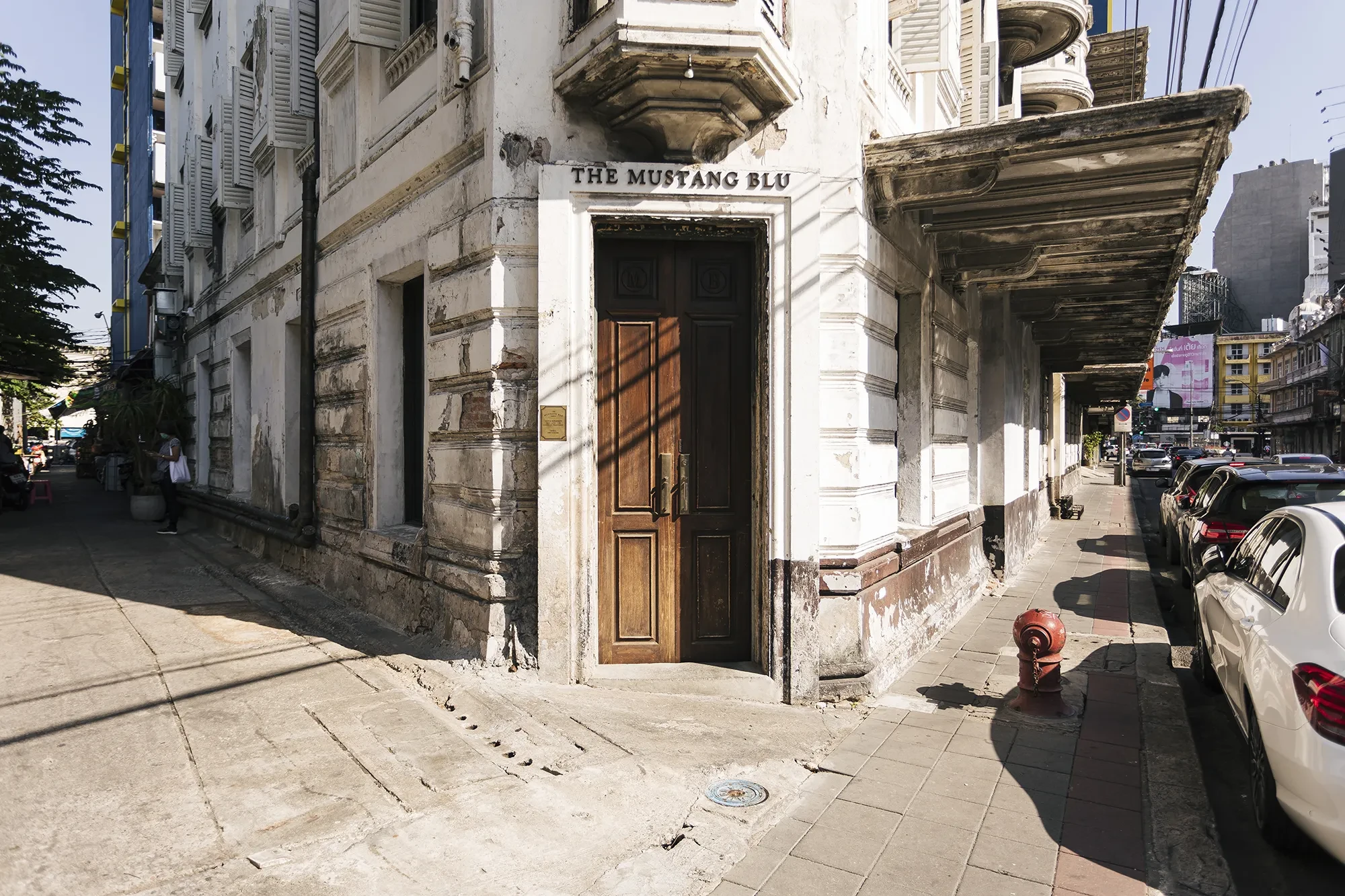 แค่เดินผ่านตึกด้านนอกก็ชวนสงสัยแล้วว่าด้านในจะเป็นอย่างไร อาคารแห่งนี้เคยเป็นอาบอบนวดมาก่อน และเก่าแก่ถึงขนาดมีอายุกว่าศตวรรษ ด้านนอกของ The Mustang Blu สวยงามและโดดเด่นด้วยสีขาวที่ตั้งเดี่ยวๆ ตระหง่าอยู่บนถนนไมตรีจิตรที่มุ่งออกจากวงเวียน 22 หน้าต่างติดฟิล์มไว้ไม่ให้คนนอกสามารถเห็นข้างในได้ ทำให้ที่แห่งนี้ลึกลับขึ้นไปอีกเท่าตัว