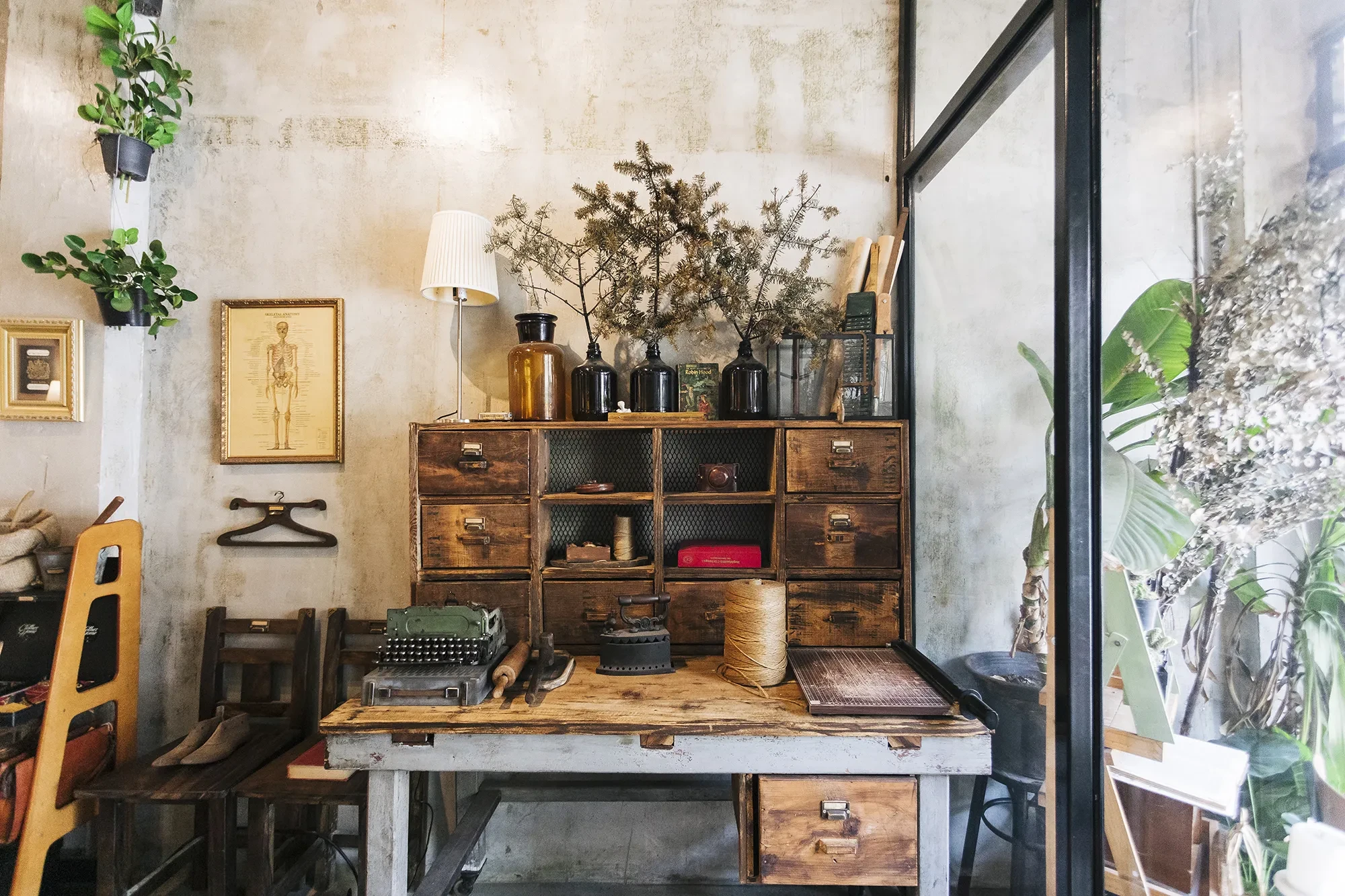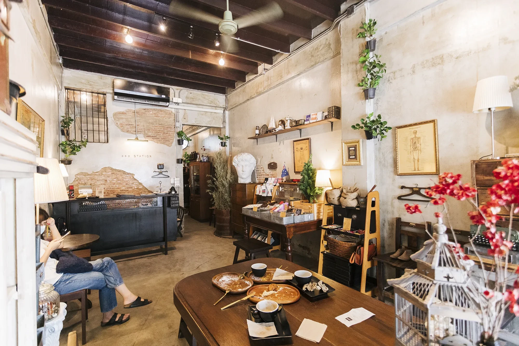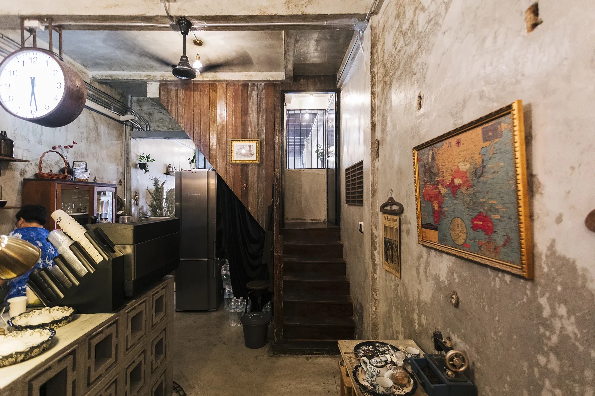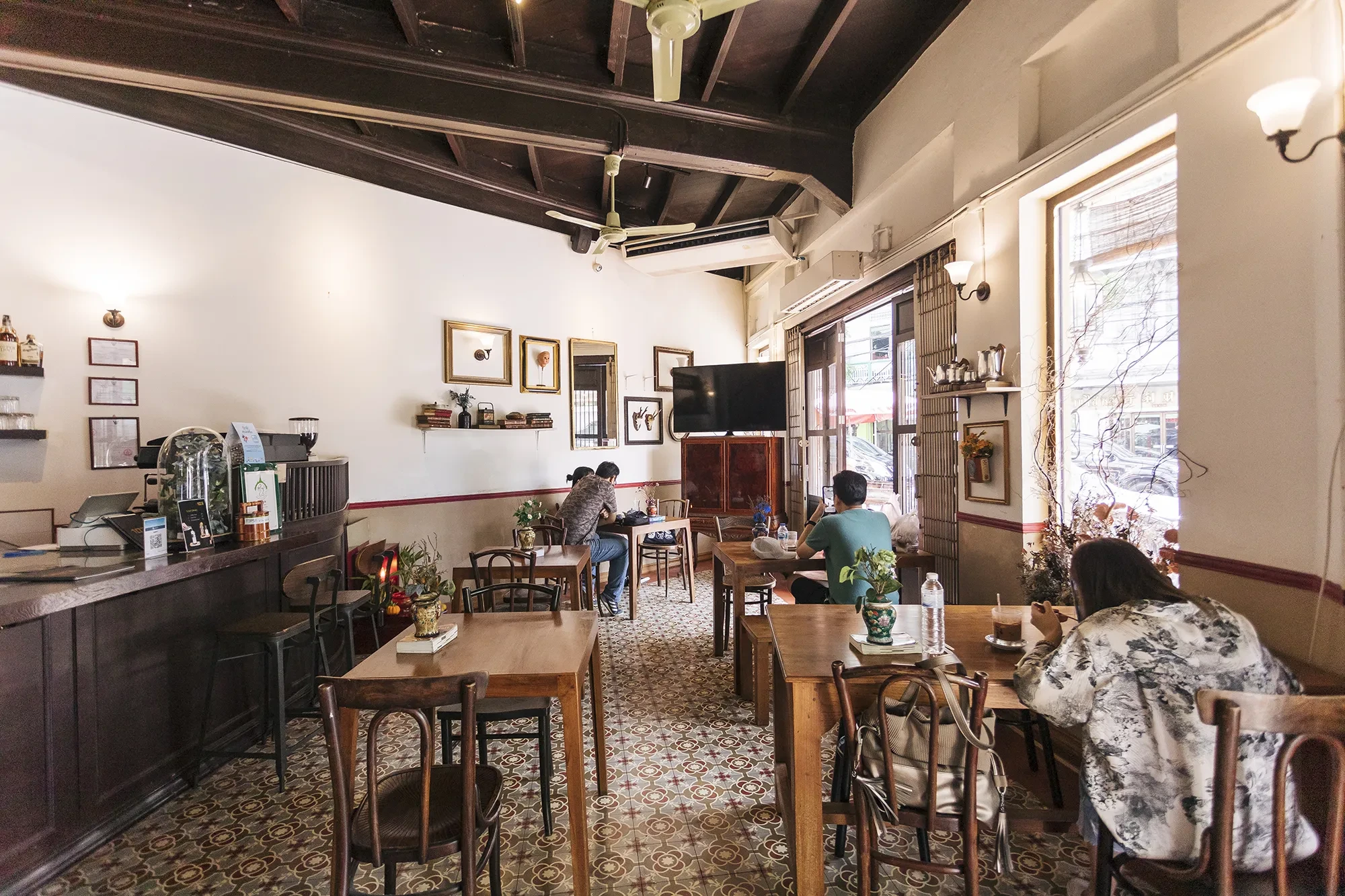 เฟอร์นิเจอร์ในร้านเป็นของวินเทจทั้งหมด วางห่างกันหลวมๆ ทำให้อาคารขนาดคูหาเดียวดูโปร่งโล่ง ถ้าสังเกตจัเห็นว่าโครงสร้างถูกปล่อยไว้ให้เห็นความเก่า กลายเป็นสไตล์ที่เก๋ไก๋ไปอีกแบบ