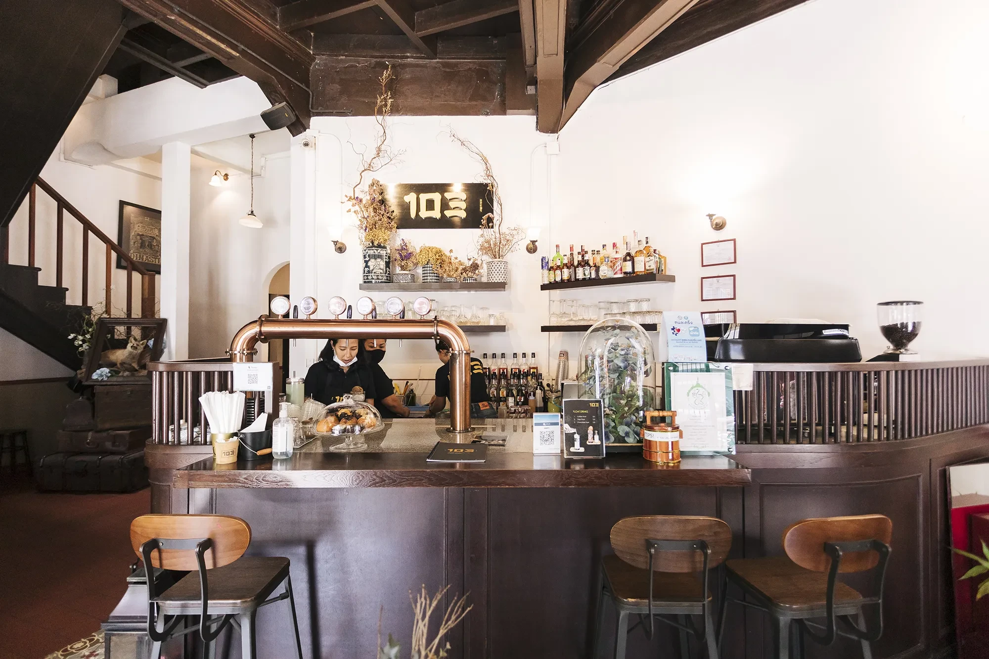 ทันทีที่เข้าไปในร้านก็ให้กลิ่นอายแบบโรงน้ำชาจีนสมัยก่อน คาเฟ่จองตึกตรงหัวมุมถนน ส่วนทางเข้าโรงแรมอยู่ด้านข้างติดกัน ก่อนเคยเป็นร้านขายยาจีน เปลี่ยนมาเป็นร้านทำป้ายไฟตัดสติ๊กเกอร์ แล้วจึงกลายเป็น 103 Bed and Brews ในวันนี้