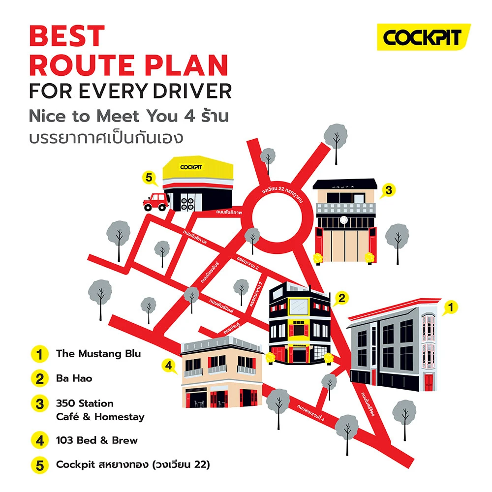 เราขอแนะนำคาเฟ่และร้านอาหารในโรงแรมทั้งสี่ที่ล้วนตั้งอยู่ในอาคารเก่าและยังเก็บร่องรอยประวัติศาสตร์ รายละเอียดทางสถาปัตย์ฯ เอาไว้อยู่ อย่างร้านกาแฟที่รีโนเวทจากร้านขายอะไหล่อายุหลายสิบปี บาร์ในอาคาร 70 ปี บูติคโฮสเทลที่ปรับเปลี่ยนจากร้านขายยาจีนโบราณ และอาบอบนวดที่เปลี่ยนเป็นร้านอาหารและโรงแรมสไตล์โคโลเนียลอย่างพิถีพิถันทุกรายละเอียด และหากไปแล้ว อย่าลืมแวะไปที่ Cockpit สหยางทอง (วงเวียน 22) ที่อยู่ใกล้กันแบบเดินถึง ตรวจเช็คสภาพรถพร้อมรับสิทธิ์ใช้โปรโมชั่นพิเศษทันที
