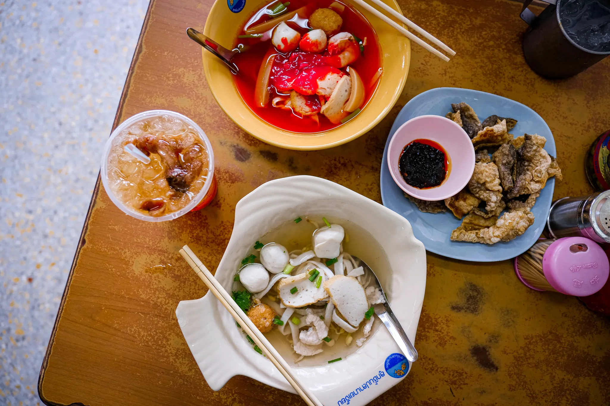 ร้านแรกเรามาเริ่มกันที่ร้านลูกชิ้นปลานายเงี๊ยบ ร้านก๋วยเตี๋ยวลูกชิ้นปลาในตำนานที่เปิดมานานมากกว่า 80 ปี แน่นอนว่าร้านนี้ขึ้นชื่อในเรื่องเมนูก๋วยเตี๋ยวเส้นปลา ลูกชิ้นปลาลวกจิ้ม หนังปลาทอดกรอบ ลูกชิ้นปลาของที่ร้านทำมาจากปลา 3 ชนิด ปลาหางเหลือง ปลาดาบยาว และปลาอินทรี จึงทำให้ลูกชิ้นปลาของที่ร้านมีความนุ่ม เด้ง ดึ๋ง สู้ฟันมาก ๆ แถมยังไม่คาวอีกด้วย วัตถุดิบคัดสรรมาอย่างดี ทำวันต่อวัน ส่วนเมนูเส้น ที่เป็นเมนูฮอตฮิต ใครมาแล้วต้องสั่งคือก๋วยเตี๋ยวเส้นปลา กินคู่กับหนังปลาทอดกรอบที่เสิร์ฟมาพร้อมกับน้ำพริกเผากุ้ง เข้ากันได้เป็นอย่างดี ต้องบอกเลยว่าใครที่เป็นสายลูกชิ้นปลาเลิฟเว่อร์ มากินร้านนี้ไม่มีผิดหวังแน่นอน