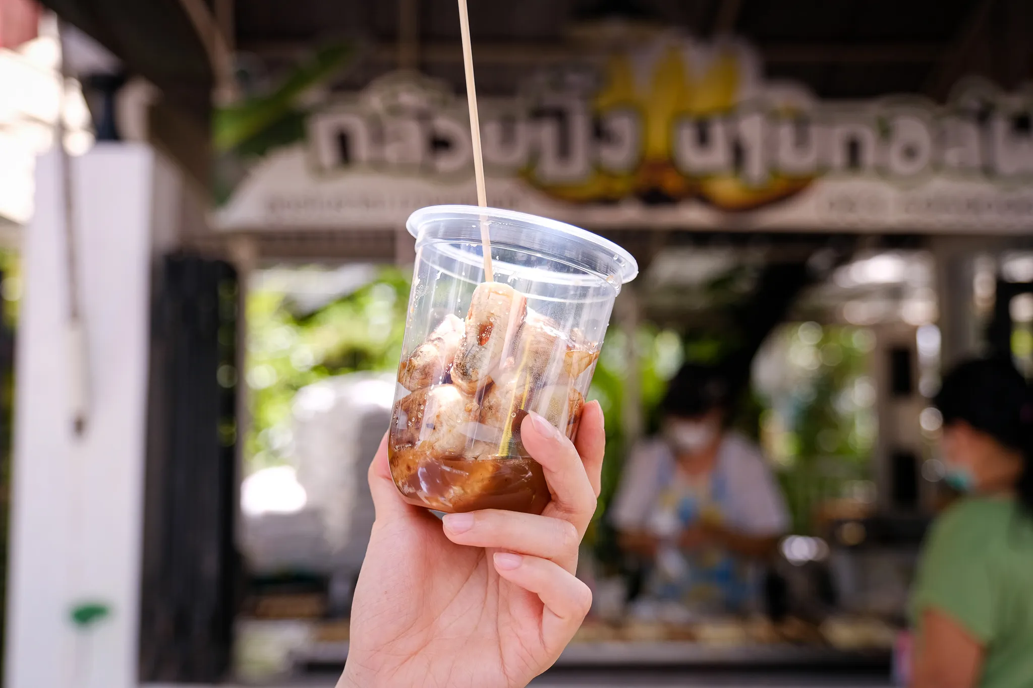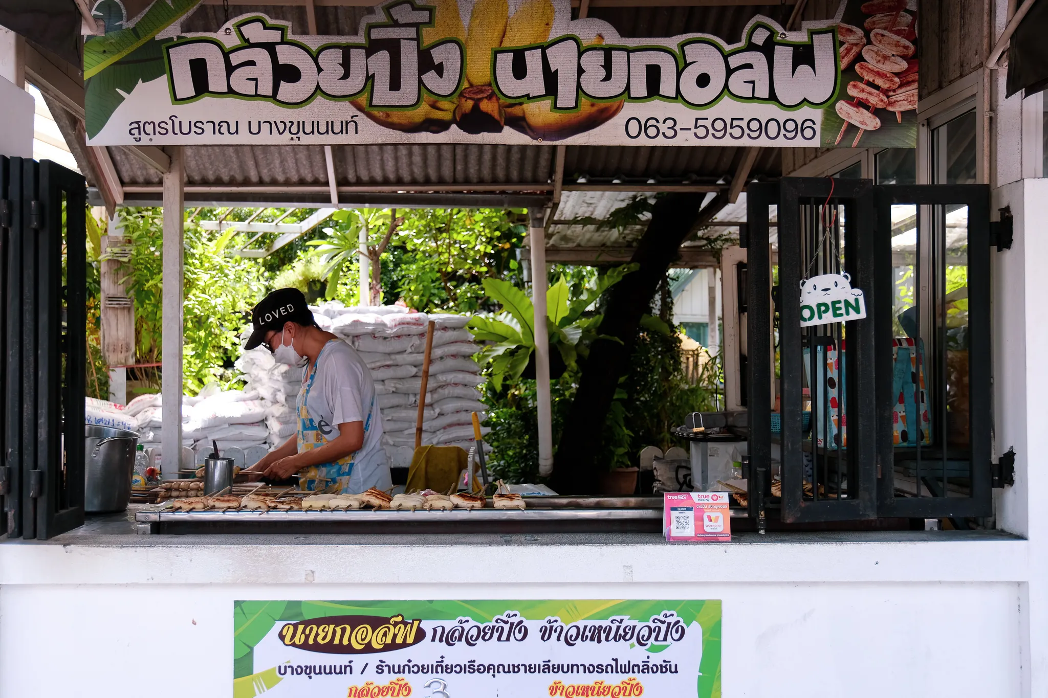 นายกอล์ฟกล้วยปิ้ง ข้าวเหนียวปิ้ง (บางขุนนนท์) ถ้าผ่านมาแถวบางขุนนนท์ไม่แวะถือว่าผิดมาก เป็นอีกหนึ่งร้านที่มีลูกค้ายืนมุงอยู่หน้าร้านเยอะเลย ปิ้งแบบไม่ได้พัก ความอร่อยคงต้องไม่ธรรมดาแน่ ๆ มีทั้งแบบราดน้ำตาลเคี่ยวแบบกล้วยทับ และแบบเค็มพ่นน้ำเกลือ เราสั่งแบบราดน้ำตาลเคี่ยวมาชิมกล้วยเนื้อไม่แข็งมากกำลังดี กับน้ำจิ้มหวานแหลม ๆ เข้ากันดีเชียว กล้วยปิ้งราคา 25 บาท/ไม้