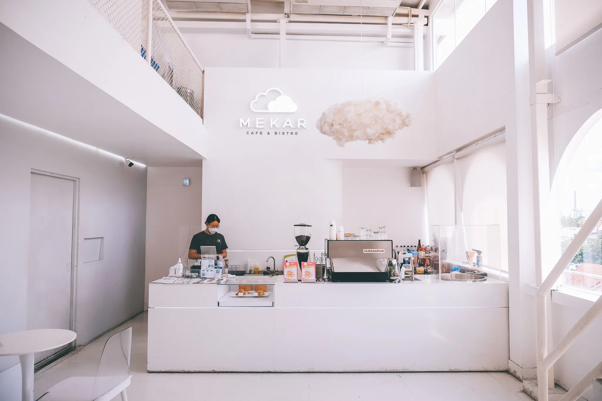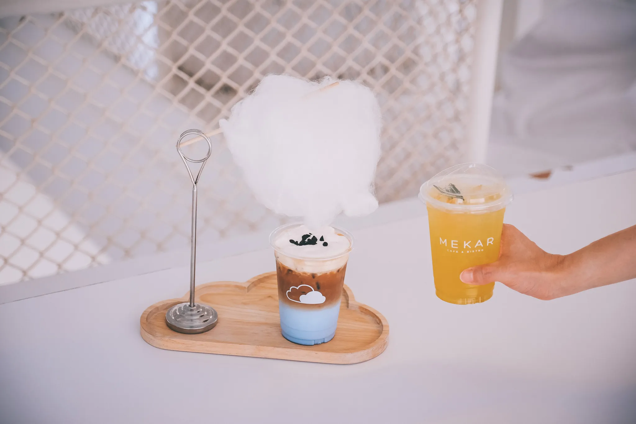 เมฆาคาเฟ่ Rooftop สไตล์มินิมอล สีขาวสบายตา ธีมก้อนเมฆ ที่เปิดบนชั้นดาดฟ้าของอาคารว่องวิวรรธน์ เปิดเป็นทั้งร้านอาหาร คาเฟ่ ร้านนั่งดื่มสังสรรค์กับชาวแก๊งแฮงเอาท์กันแบบยาวๆ ได้ถึงยามค่ำคืน ขอบอกว่าบรรรยากาศชิลมาก ๆ ติด MRT บางขุนนนท์ มีมุมนั่งชิลทั้งด้านนอกมีบีนแบคสำหรับเอนหลังนั่งดื่มสบาย ๆ และด้านในร้านห้องแอร์เย็น ๆ ไฮไลท์มุมถ่ายรูปกับตัวร้านสีขาว และโลโก้ก้อนเมฆคิวท์ ๆ ที่นี่มีเมนูเยอะพอสมควรเลยทีเดียวทั้งของกินเล่น และเมนูเครื่องดื่ม เราเลือกไปทางเมนูคาเฟ่ที่นำเอา Cotton Candy มาเป็นลูกเล่นน่ารัก ๆ เข้ากับชื่อร้าน ทำเป็นเหมือนปุยเมฆลอย ๆ ถ่ายรูปออกมาสวยเลยสีสันสดใส