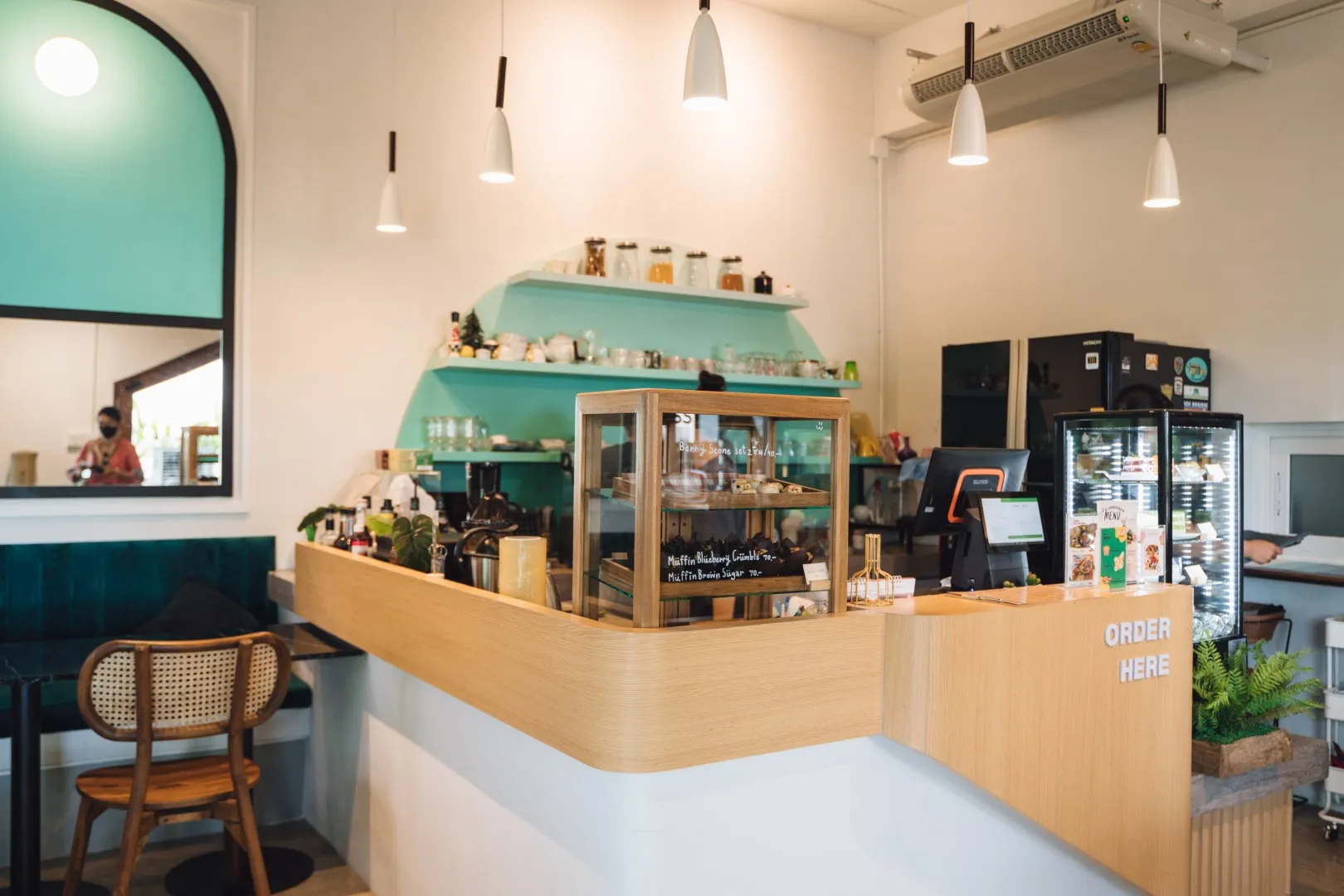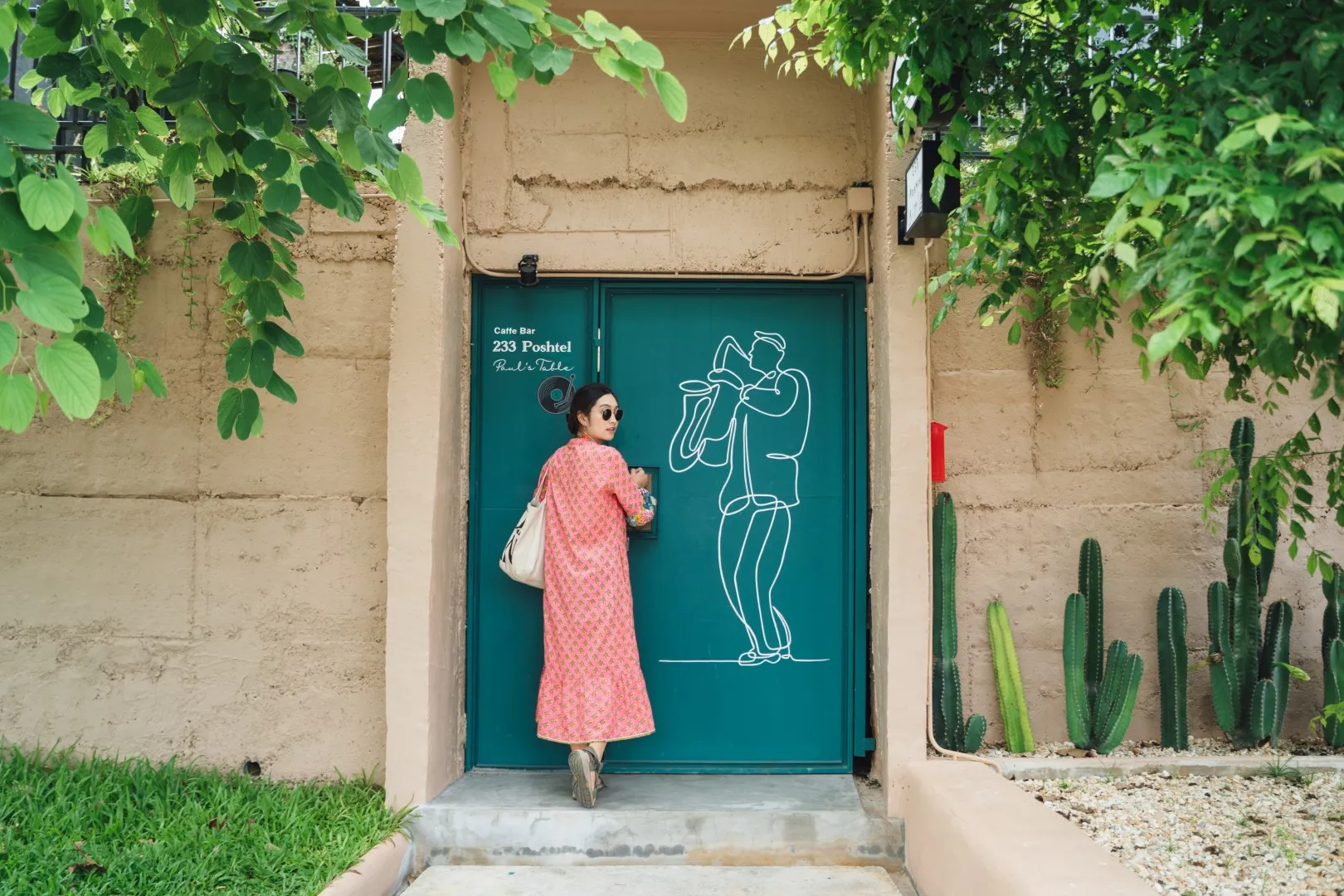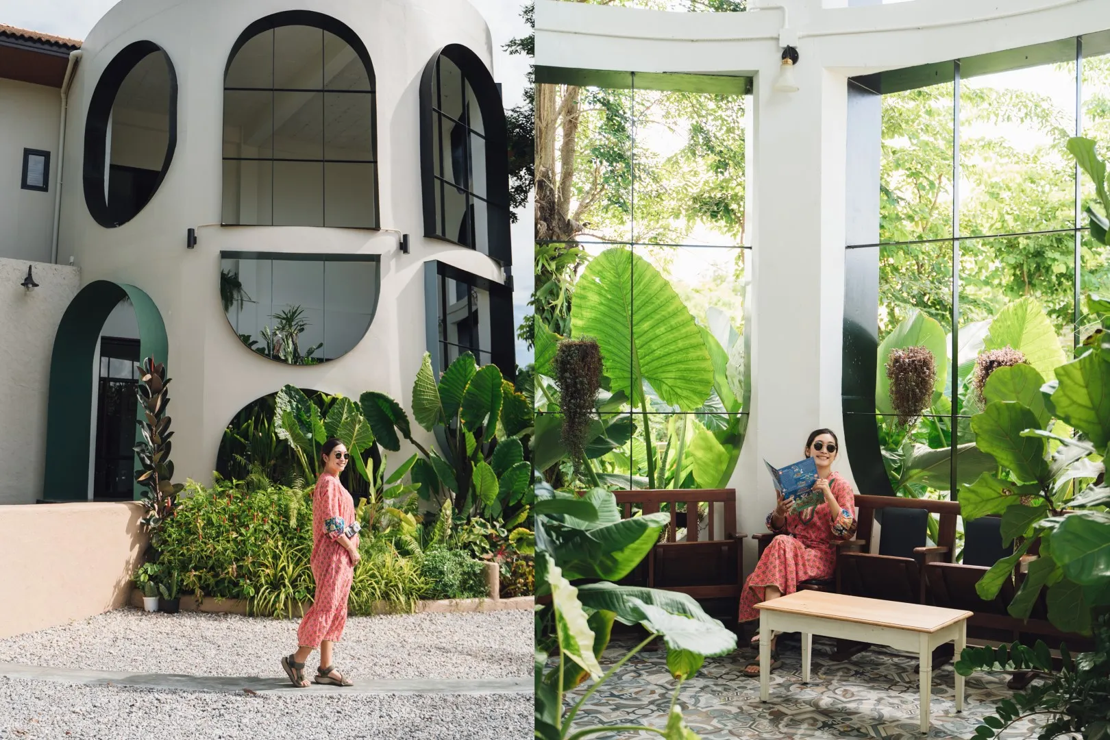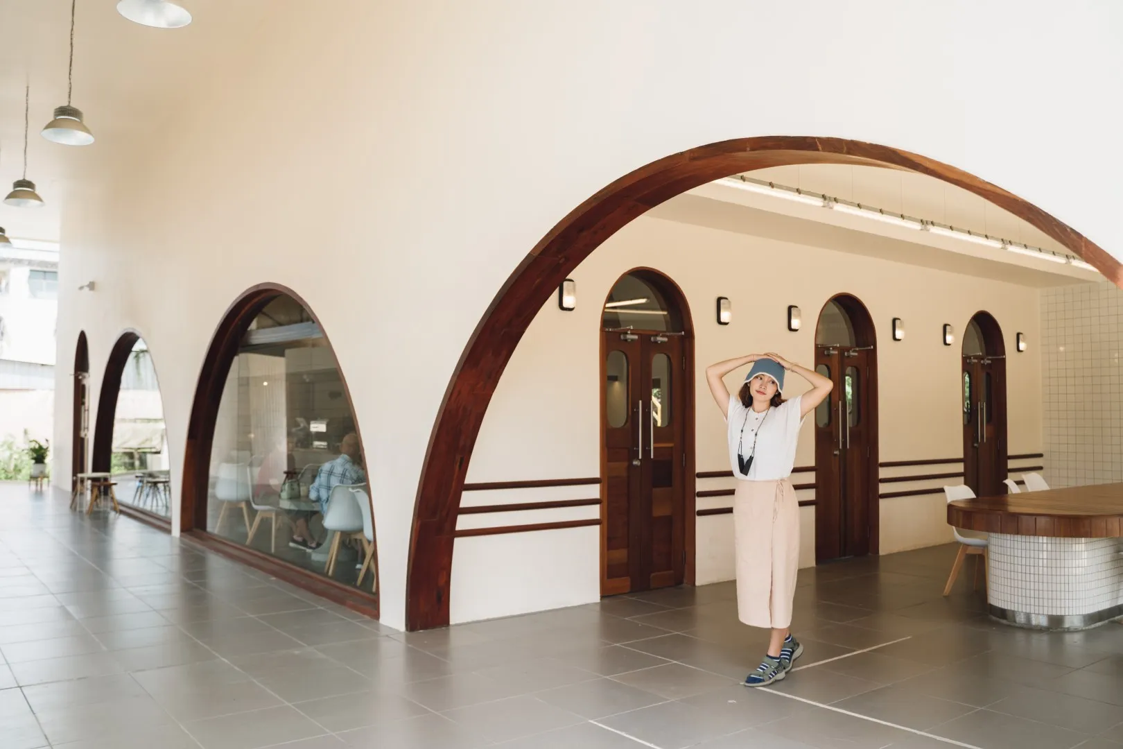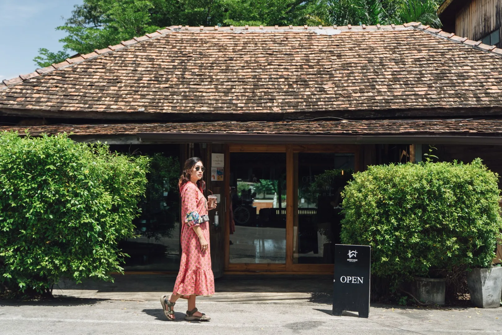 คาเฟ่สุดเก๋ไก๋ ที่เป็นทั้งที่พัก ร้านอาหาร และคาเฟ่ ตั้งอยู่ติดกับแม่น้ำวัง ทางเข้าร้านมีสองฝั่ง โดยฝั่งที่ติดกับแม่น้ำวัง จะมีทางเข้าเป็นประตูสีเขียว มีลายเส้นการ์ตูนสุดน่ารักชวนให้หยุดถ่ายรูปได้ไม่ยาก ส่วนอีกฝั่งต้องสะดุดตากับดีไซน์ชิค ๆ แปลกตาที่ไม่ค่อยได้เห็นที่ไหน ตัวอาคารสีขาว มีช่องหน้าต่างขอบสีเขียวรูปทรงโค้งเปิดโล่งขนาดใหญ่รับลม และแสงธรรมชาติเข้ามาด้านในร้าน ตกเเต่งด้วยต้นไม้ที่แทรกอยู่ตามมุมต่าง ๆ ได้อย่างสวยงาม ชวนนั่งชิลสุด ๆ ด้านหน้าร้านถือว่าเป็นจุดไฮไลท์มุมถ่ายรูปที่ห้ามพลาดเลย รับรองว่าได้รูปสวย ๆ ไปอัพโซเชียลกันถ้วนหน้าแน่นอน