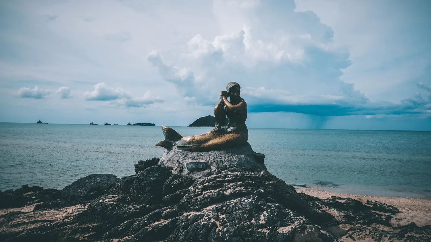ปฏิมากรรมรูปนางเงือกนั่งอยู่บนโขดหิน อีกแลนด์มาร์คหลักของจังหวัดสงขลาที่มีชื่อเสียงเป็นอย่างมาก ที่ใคร ๆ ก็ต้องแวะมากให้ได้ ด้านหลังเป็นเกาะหนู เกาะแมว ซึ่งเป็นอีกหนึ่งตำนานของที่นี่ ชายหาดน่าเดินเล่นมาก ทรายขาวละเอียด ตลอดแนวชายหาดยังจัดเป็นสถานที่พักผ่อนทางวิ่งออกกำลังกาย มาหาดสมิหลาทั้งทีอย่าลืมกิจกรรมขี่ม้าชมหาดดูนะ