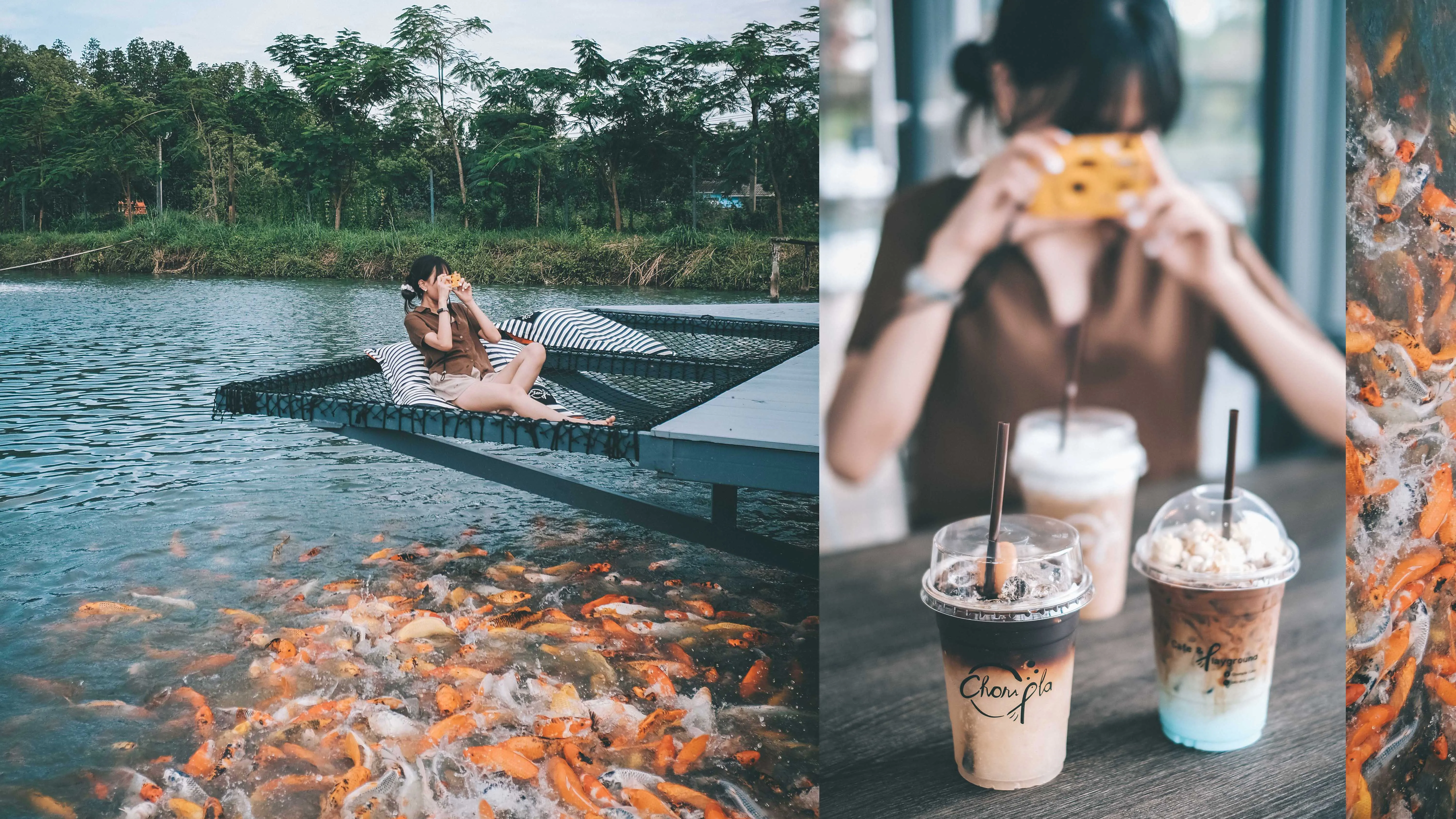 คาเฟ่กลางบ่อปลาคราฟ ที่ปลาคราฟเยอะมาก เยอะจริง แบบไม่จกตา ตัวร้านมีทั้งโซนด้านในห้องแอร์ และเอ้าดอร์ด้านนอก ให้เราได้นั่งชิล พร้อมทั้งให้อาหารปลา เมนูเครื่องดื่ม อาหาร ก็เยอะมาก เลือกได้ตามใจชอบไปเลยจ้า มีอาหารปลาขายขวดละ 20 บาท อยากได้รูปปลาปัง ๆ ก็เอามาอาหารปลามาโรยได้เลยจ้า