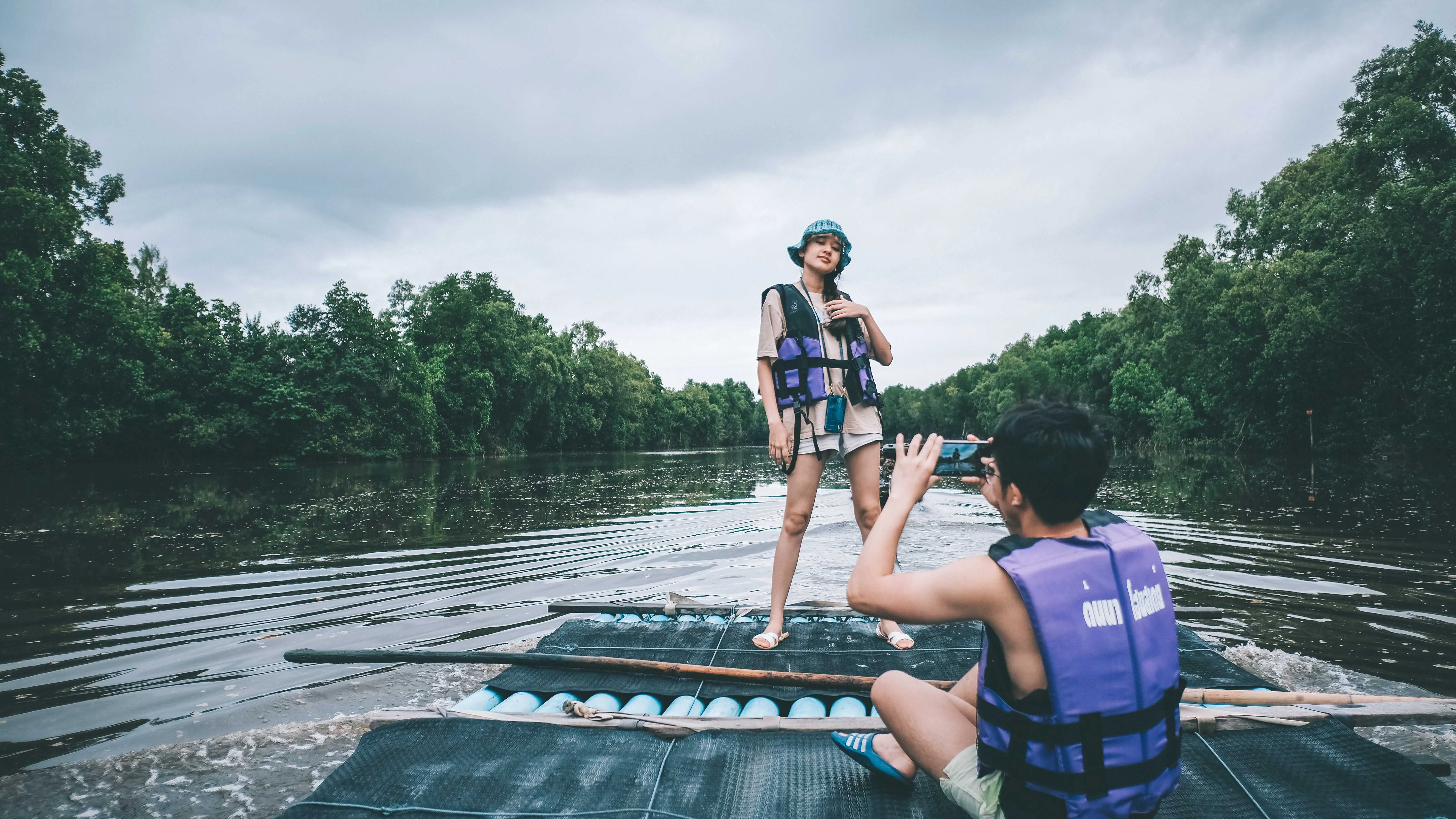 กลับห้องไปเปลี่ยนเสื้อผ้าพร้อมเปียกจ้า เพราะเดี๋ยวต้องไป กิจกรรมล่องแพเปียก ชมนกเหยี่ยวแดง 14.30 น. เดินไปรอกันที่หน้าโฮมสเตย์ที่เราเช็คอินได้เลย นั่งรถกะบะแล้วเค้าจะพาเราไปยังที่ขึ้นแพ เอ้าใส่เสื้อชูชีพพร้อมแล้วจ้า ลงแพได้ นั่งประจำที่ ถ่ายรูปสัก 1 กรุบ โดยจะใช้เรือลากจูงแพของเราไปตามคลอง ระหว่าง 2 ฝั่งทางเราก็จะมองเห็นวิวทิวทัศน์ของป่าชายเลนที่เป็นสถานที่อนุบาลสัตว์น้ำ รวมถึงจะมองเห็นเหยี่ยวแดงที่บินโฉบลงมาหาเหยื่อตามผิวน้ำอีกด้วย โอ้ย ชิลมากเด้อ ใช้เวลาประมาณ 1 ชั่วโมงในการล่องแพ