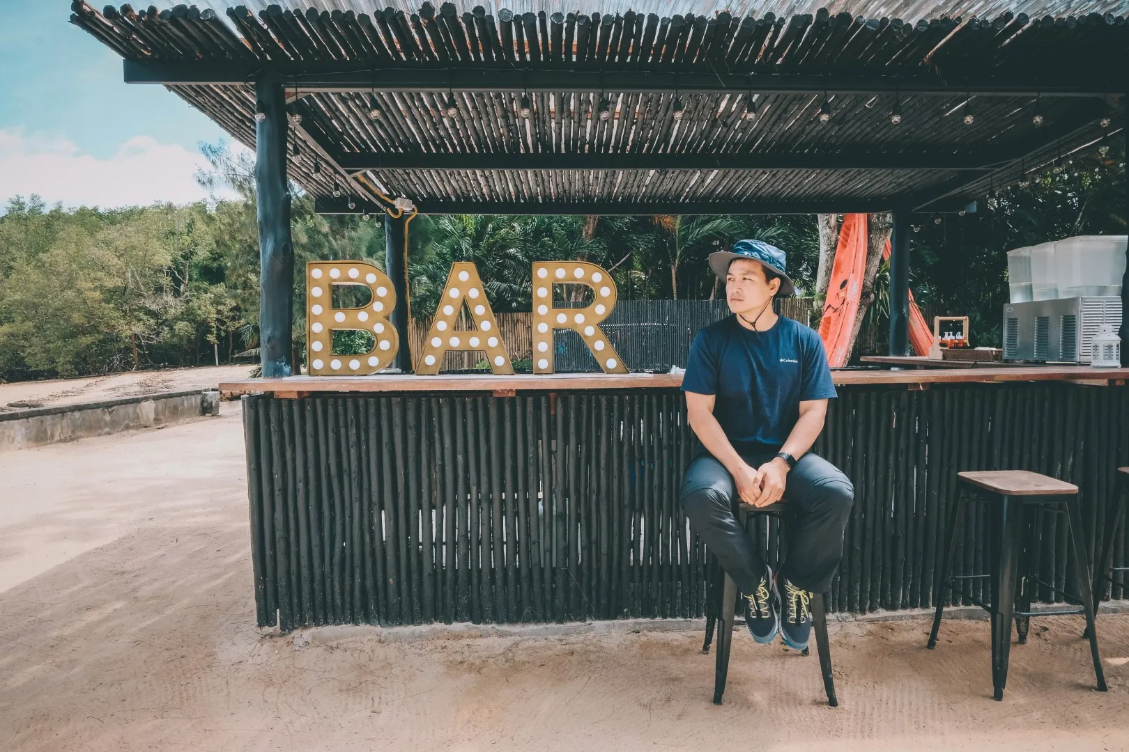 เฮ้ย! มันเก๋มาก เต็นท์กระโจมสีดำ ที่ตั้งอยู่ริมทะเลใต้ต้นสน ตั้งอยู่ภายในบริเวณโรงแรม เดอะ แมงโกรฟ พันวา ภูเก็ต รีสอร์ท บรรยากาศรอบ ๆ คือชิลเว่อร์ ถึงจะเป็นฟีลนั่งเอ้าท์ดอร์ก็ไม่ร้อนอย่างที่คิด มีลมทะเลพัดมาโชย ๆ มีที่นั่งกระจายอยู่รอบ ๆ ร้าน ภายในเต้นท์ก็จะมีเคาท์เตอร์ชงเครื่องดื่มให้บริการ ยิ่งถ้ามาช่วงเย็น ๆ นะพวกเธอแสงคือดีงาม สวยเว่อร์วังเด้อ ที่นี่ยังมีให้บริการพายเรือคายัค และแพดเดิ้ลบอร์ด ฟรี! ด้วยนะ ไม่มีขั้นต่ำในการสั่งอาหาร ใครชอบกิจกรรมสนุก ๆ ก็อย่าลืมเตรียมเสื้อผ้ามาเปียกด้วยหล่ะ