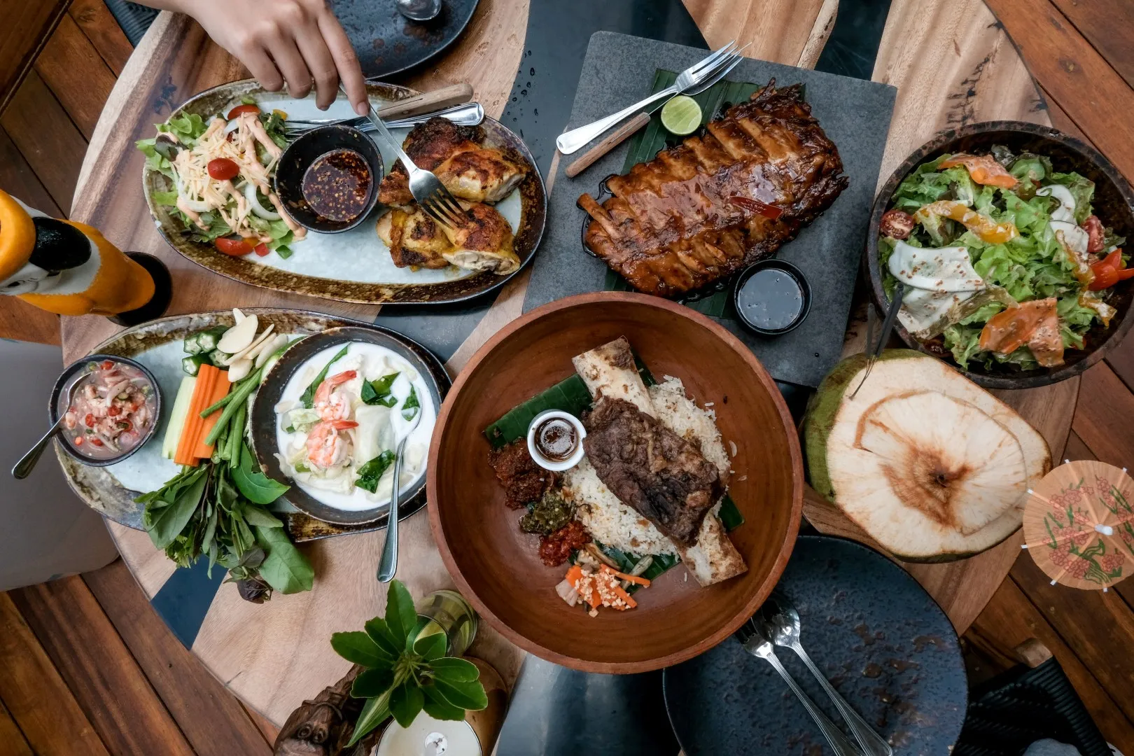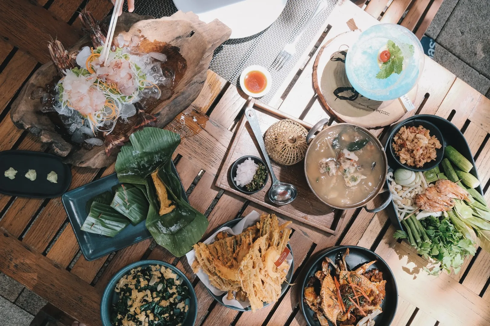 อีกหนึ่งร้านที่เราต้องกลับมาซ้ำทุกรอบที่มาภูเก็ต ร้านอาหาร และคาเฟ่ สไตล์บาหลี ที่โคตรจะทรอปิคอล ซ่อนตัวอยู่กลางป่าได้อย่างกลมกลืน ตัวร้านออกแบบด้วยวัสดุธรรมชาติอย่างไม้ไผ่ มุงหลังคาด้วยหญ้าคา รายล้อมไปด้วยธรรมชาติสีเขียวของแมกไม้นานาพันธุ์ บรรยากาศดีมาก ๆ เหมาะกับการหนีร้อนมานั่งจิบกาแฟ หรือจะหนีมาหามุมอ่านหนังสือพร้อมเครื่องดื่มเย็น ๆ ใต้ร่มไม้ใหญ่ มุมถ่ายรูปเยอะมาก คนชอบถ่ายรูปนี่คือเลิฟเลย ร้านนี้ไม่ได้มีดีแค่คาเฟ่นะ แต่เมนูอาหารคือปังไม่ไหว เป็นแนวฟิวชั่น เมนูหลากหลายมาก มื้อแรกพวกเราก็จัดเต็ม ไปเลยจ้า เมนูแนะนำห้ามพลาด! หนุมานประสานกาย จะเป็นชุดน้ำชุบหยำ พร้อมผัก, ไก่ย่างวานร ไก่นุ่ม ๆ พร้อมน้ำจิ้มรสแซ่บ, ซี่โครงหมูย่างฉ่ำ ๆ ละลายในปาก อิ่มแบบจุก ๆ มากมื้อนี้